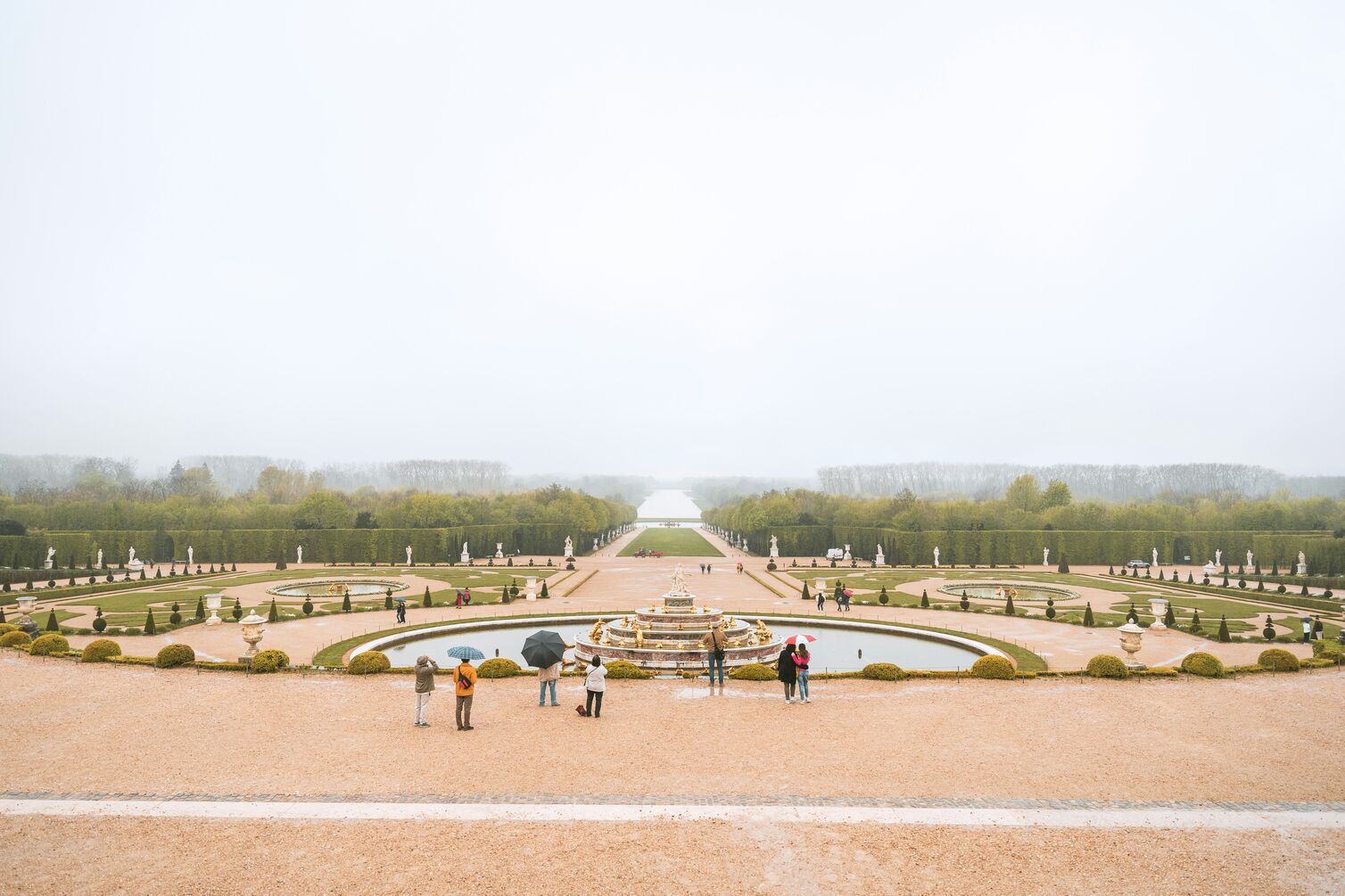 Démarrez votre balade depuis le parterre de Latone. Le soleil se couche parfaitement dans l'axe. A droite le parterre du Nord avec en contre bas le bassin de Neptune, à gauche le parterre du Midi avec l'Orangerie et la Pièce d'Eau des Suisses dans le prolongement.